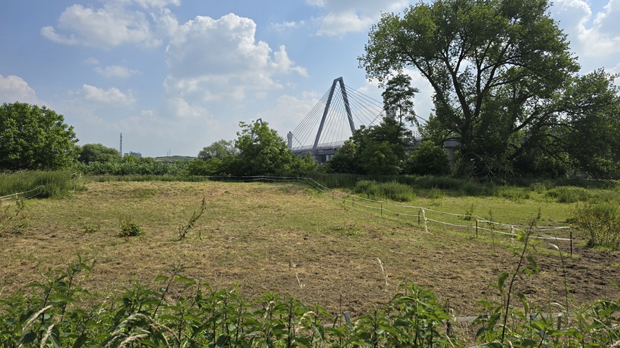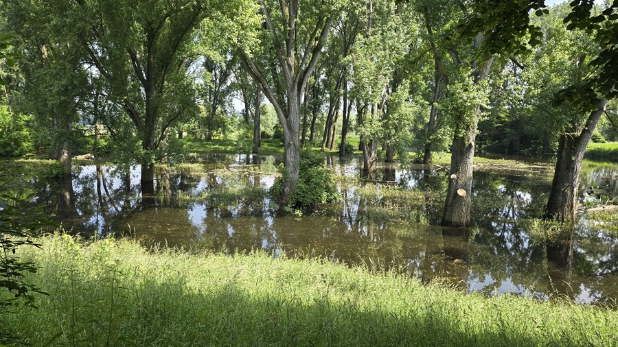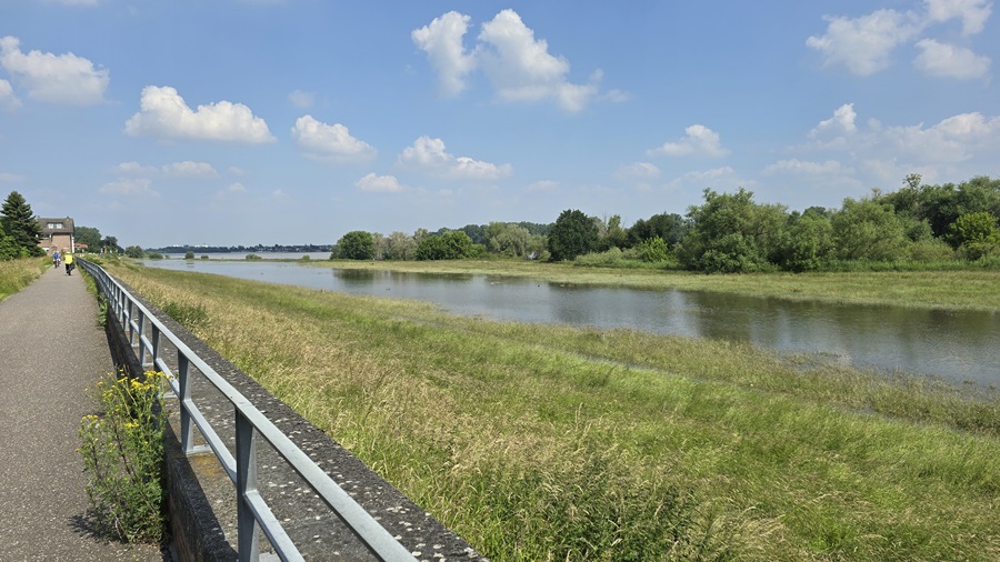 Ich verließ Köln über Niehl Richtung Norden, musste noch die Großbaustelle an der Autobahnbrücke Leverkusen umfahren und konnte dann dann auf dem Langeler Damm am Rhein entlang weiterradeln. Dabei passierte ich einen Campingplatz, der richtige Glück gehabt hat. Das Hochwasser reichte bis kurz vor die ersten Wohnwagen. Auch die Hitdorfer Fähre musste dem Hochwasser Tribut zollen – der Fährbetrieb war eingestellt. Weiter ging es auf dem Damm. Dieser Teil der heutigen Etappe gehörte zu den schönsten.