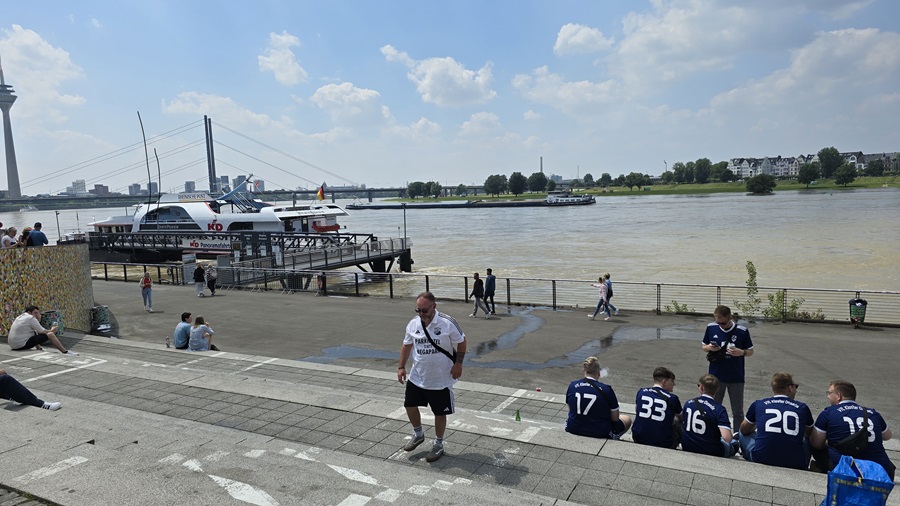 In Uedesheim verließ ich die B9 und überquerte auf einem Radweg entlang der A46 den Rhein. Dann ging es schnurstracks Richtung Norden ins Zentrum von Düsseldorf. Auch dort wurde gehämmert, was das Zeug hielt. Ihr kennt es euch denken: Euro 2024, Fanmeile direkt am Rhein. Ich konnte auch schon die ersten Fans sichten, von denen einige bereits um 14:00 Uhr kräftig in der Schieflage waren. Auch die Stimmbänder wurden eingestimmt auf Fußball. Will ja alles trainiert sein. Ich machte in Düsseldorf nun meine „offizielle“ Mittagspause und genehmigte mir einen Hackbraten mit Kartoffelpüree und Spargelsauce. Es schmeckte sehr gut. Dazu genehmigte ich mir ein kleines Altbier. Das ist Pflicht in Düsseldorf.