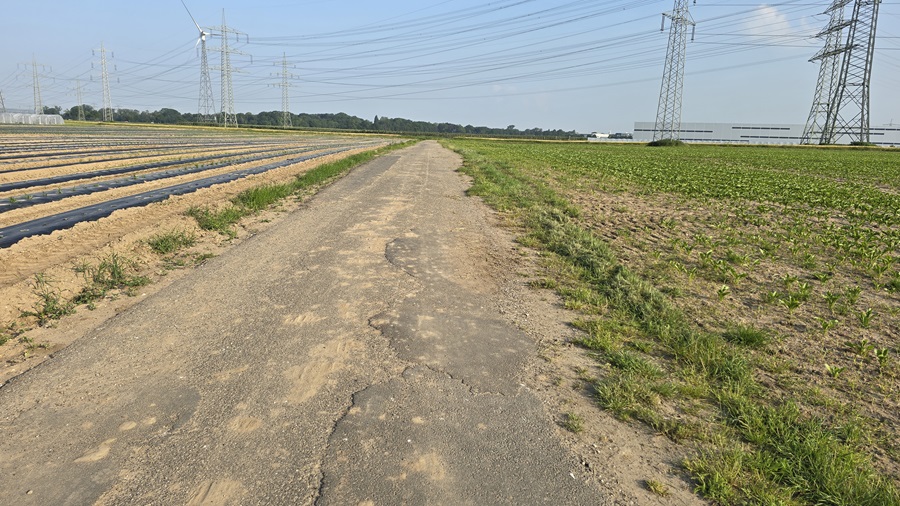 Gegen 7:30 Uhr ging es auf die Piste. Auf bekannten Rumpelwegen, wie sie mir heute noch öfters begegnen sollten, ging es aus Bornheim hinaus, über Gemüsefelder nach Wesseling,, vorbei an Chemieanlagen und dann in Richtung Köln. Der Rheinradweg nördlich von Wesseling war leider nicht befahrbar, so dass ich einen Weg etwas westlich des Flusses wählen musste. Vorbei ging es am Forstbotanischen Garten, und nördlich von Rodenkirchen erreichte ich endlich den Fluss.
