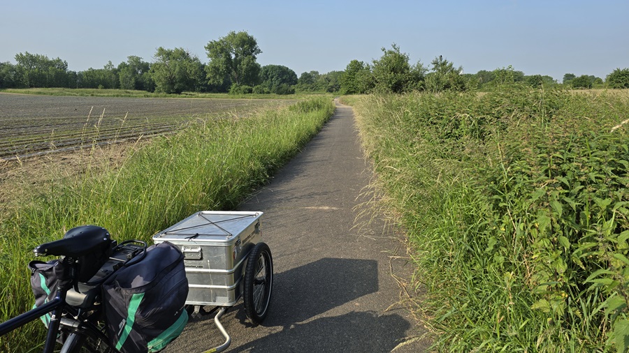 Bei Worringen erreichte ich den Radweg entlang der B9. Das war jetzt nicht das Spannendste, aber ich kam sehr schnell voran. Und – der Weg brachte mir eine erste nette Begegnung. Zwischen Dormagen und Neuss traf ich auf einen Schnellimbiss. Da ich heute noch nichts gegessen hatte, war ein Stop angesagt. Der Betreiber war ein Holländer, der sehr müde auf einem Stuhl von seiner Imbissbude saß. Er war schon seit 3:00 Uhr auf den Beinen und wollte seine Bude in wenigen Minuten zumachen. Ich war sein letzter Gast, daher bekam ich die Schnitzelsemmel zu einem reduzierten Preis und den Kaffee umsonst. Und dann kamen wir ins Gespräch. Nun ja, Gespräch ist vielleicht nicht der richtige Ausdruck. Wir kamen in einen Monolog. Der Holländer erzählte und erzählte und erzählte. Vielleicht hat er ja zu Hause nicht viel zu melden. Auf jeden Fall kenne ich jetzt sein halbes Leben. Er war im Übrigen einer der ganz wenigen Menschen, die mich nicht fragten, wo ich denn mit meinem Hänger hinwill. Wahrscheinlich hatte er sorgen, dass ich dann auch etwas sagen würde. Aber so war auf jeden Fall der Verzehr der Schnitzelsemmel nicht langweilig.