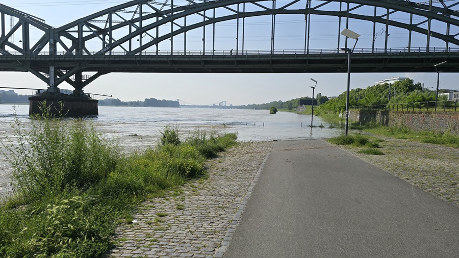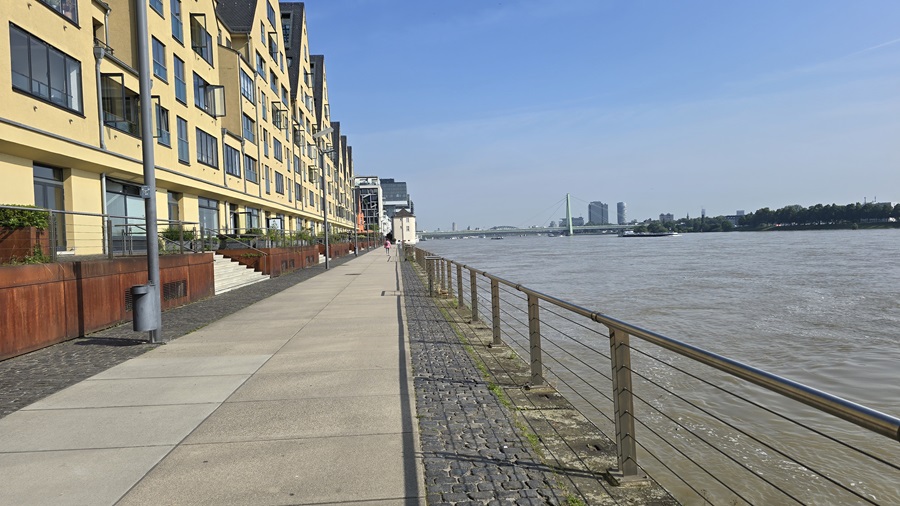 Die Rheinpromenade in Köln ist die meiste Zeit sehr belebt und daher mit dem Fahrrad schwierig zu befahren. Um diese morgendliche Zeit herrschte jedoch noch ruhiger Betrieb, so dass ich nicht nur auf die Fußgänger achten musste, sondern mich auch etwas umschauen konnte. Klar, ich kenne die Promenade sehr gut, aber mit dem Hochwasser, das den tieferliegenden Teil der Promenade geflutet hatte, war das schon spannend. Und noch etwas war anders. Es wurde gehämmert, was das Zeug hielt. Die Euro 2024 warf ihren Schatten voraus. Entlang der Rheinpromenade mit Schwerpunkt nördlich des Hauptbahnhofs wurde die Fanmeile für Public Viewing und Party aufgebaut.